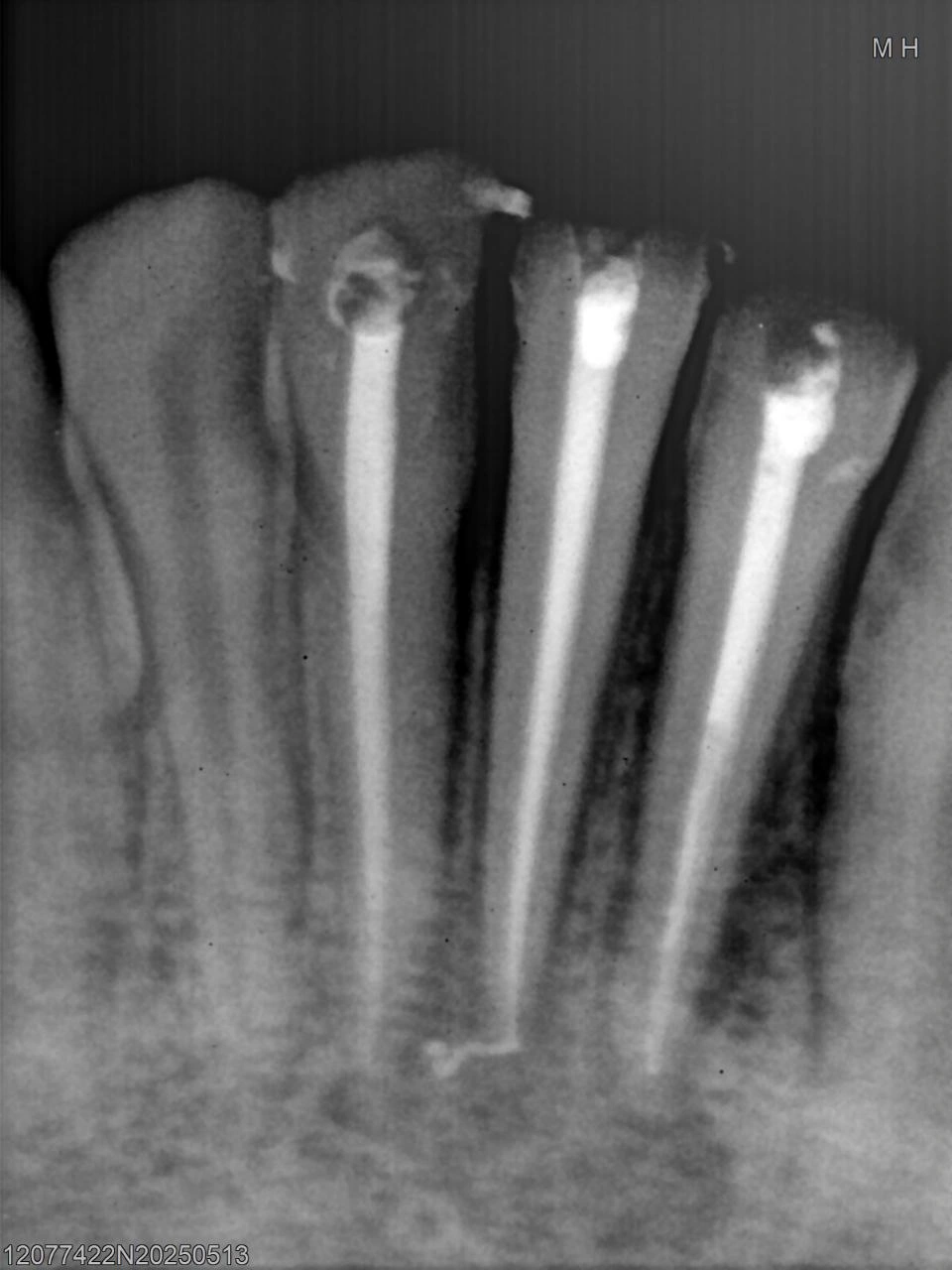 Background: The patient presented with lower anterior teeth showing signs suggestive of pulpal necrosis and periapical involvement.